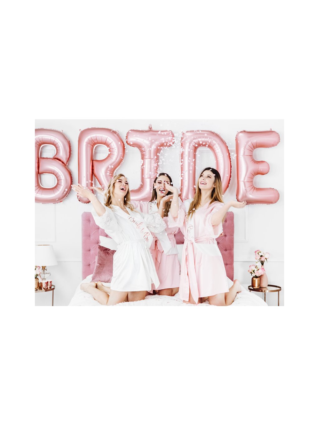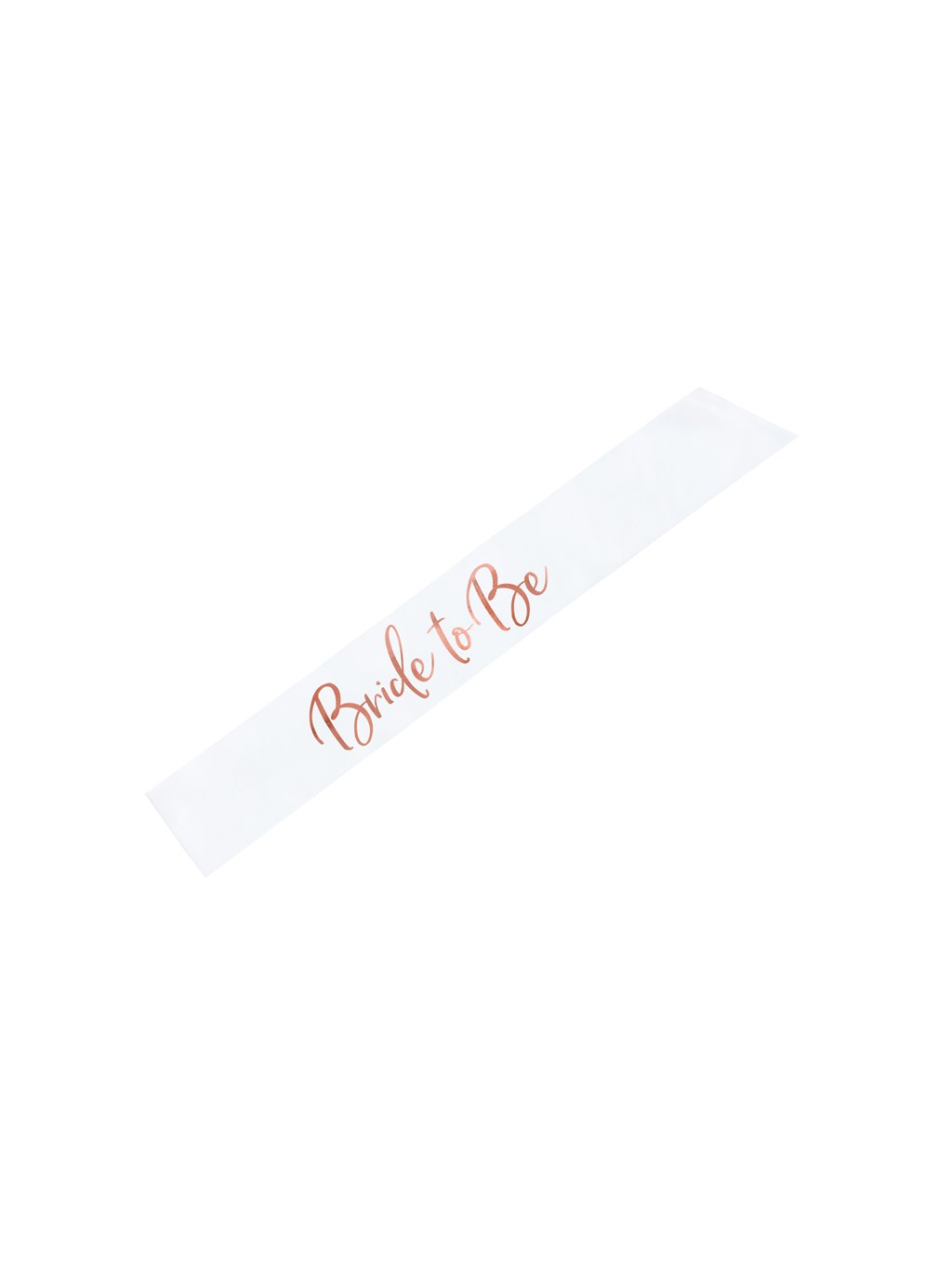 Saténové šerpa Bride to be v bílé barvě s metalickým potiskem v barvě růžového zlata na rozlučku se svobodou